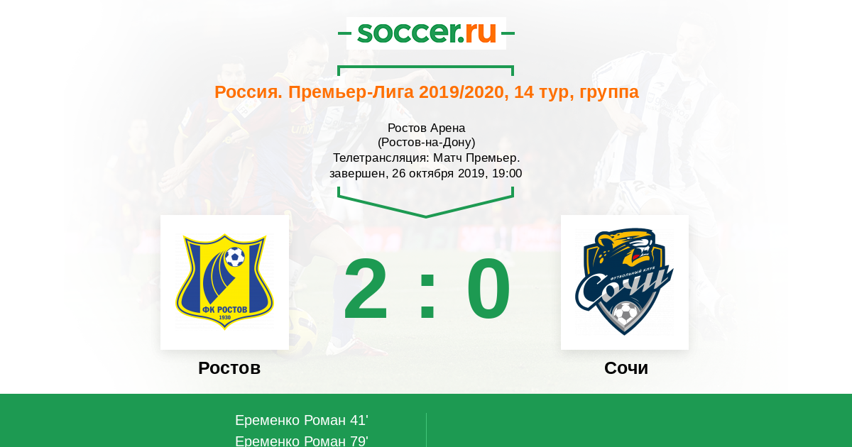 Добрый вечер, уважаемые любители российского футбола! В одном из матчей 14-го тура РПЛ "Ростов" на своём поле сыграет с набравшим неплохой ход "Сочи". После болезненного удара в Санкт-Петербурге "Ростову" будет сложно придти в себя, но домашний матч - идеальный шанс это сделать. Стоит ли ждать результативного матча на "Ростов Арене"? Сайт https://www.soccer.ru проведёт прямую текстовую онлайн трансляцию матча, следить за событиями на поле и комментировать игру для вас будет Старчеус Сергей.