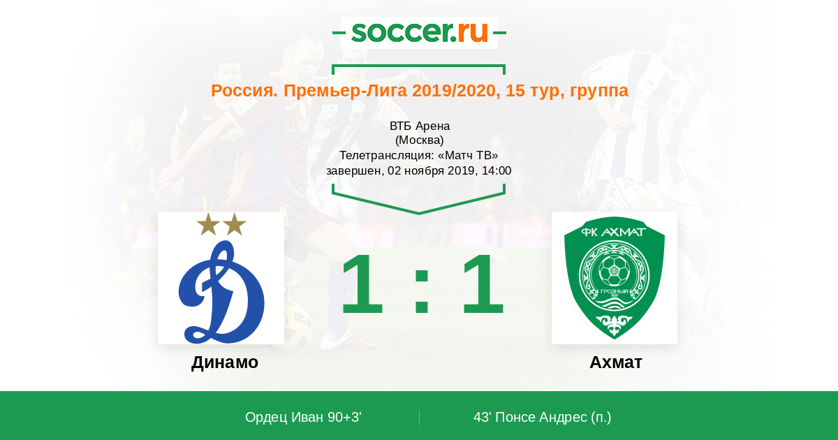 Все! Матч завершен! "Динамо" на последних минутах удалось вырвать ничью благодаря голу Ивана Ордеца. В составе "Ахмата" голом отметился Андрес Понсе. Для Вас прямую онлайн-трансляцию этого поединка провел Андрей Бабенчук. Оставайтесь на https://www.soccer.ru/!