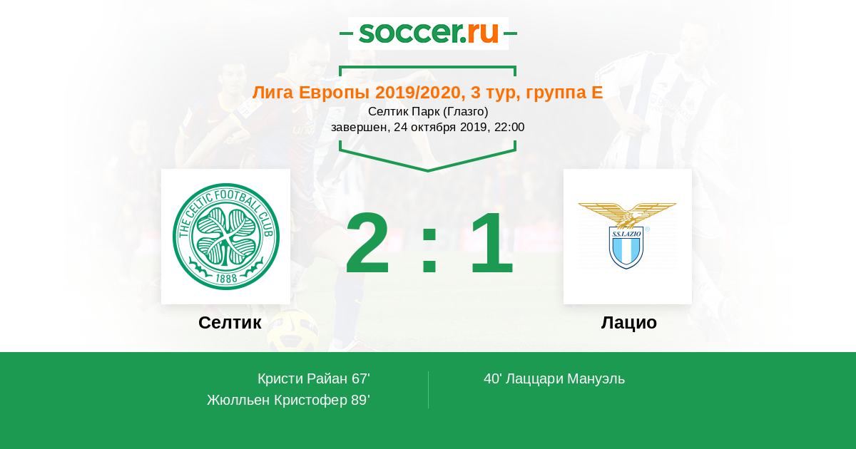 Кристоффер Айер (Селтик) наказан за задержку. Иван Бебек назначил штрафной. Штрафной получает Лацио.