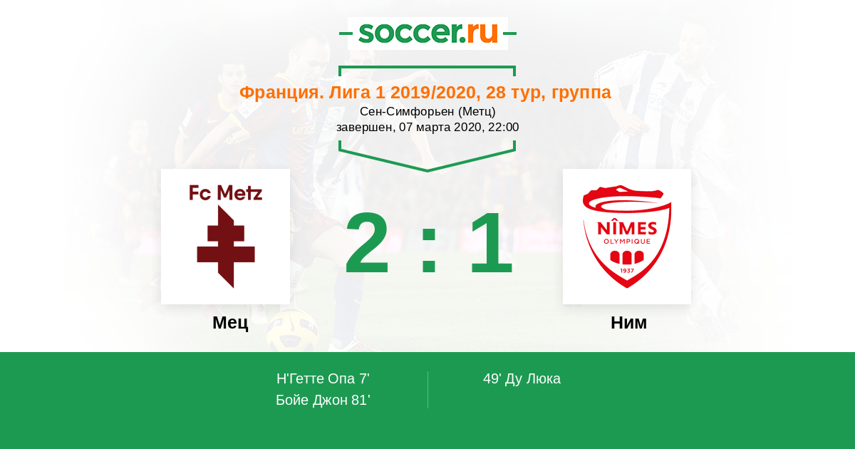Фабьен Сантонз отдает отличную голевую передачу в штрафную, где Опа Нгетте (Мец) головой отправляет мяч в сетку, прямо по центру. Он делает счет 1:0!