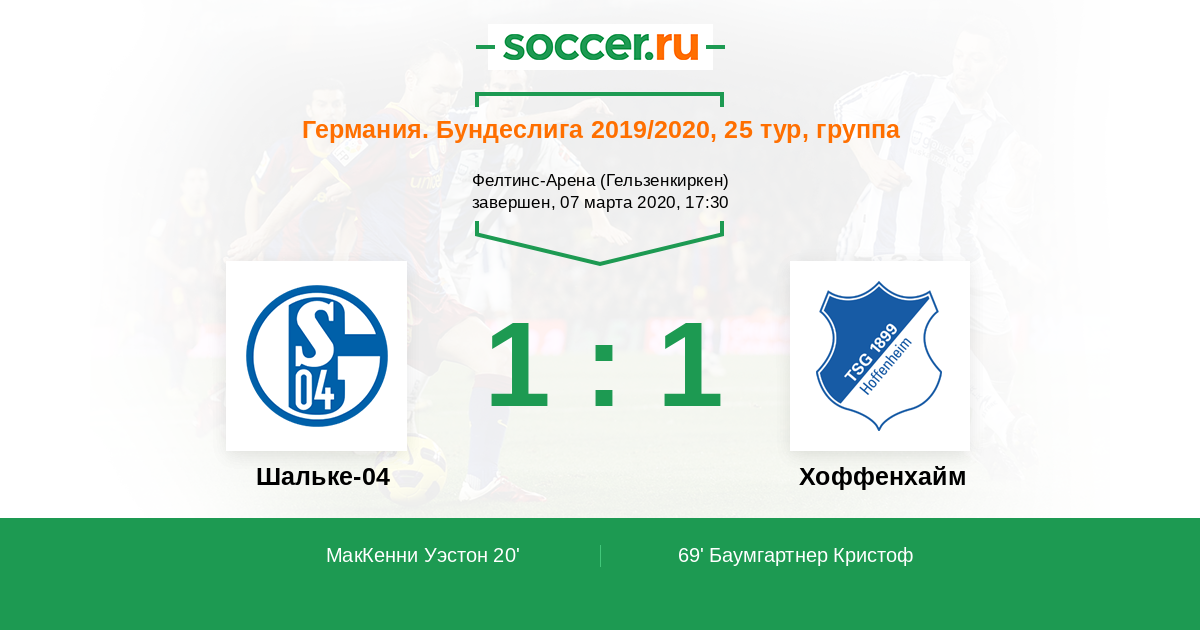 ГОЛ! Вестон Маккенни (Шальке-04) прошел сквозь оборону и с края штрафной нанес удар в нижний угол ворот. Оливер Бауманн не имел шансов допрыгнуть. Счет 1:0.