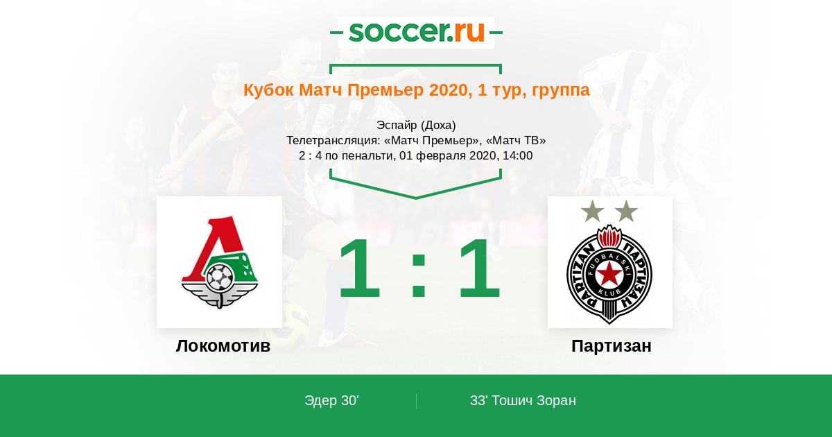 Все! Матч завершен! В первом матче Кубка Париматч Премьер "Партизан" одержал победу в серии пенальти над "Локомотивом". Для Вас прямую онлайн-трансляцию этого поединка провел Андрей Бабенчук. Оставайтесь на https://www.soccer.ru/!