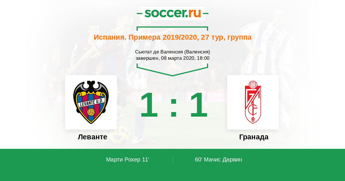 Энис Барди (Леванте) попытался пойти в дриблинг, но мяч чисто вынесли из-под него. Мяч покинул пределы поля. Гранада введет мяч в игру ударом от ворот.