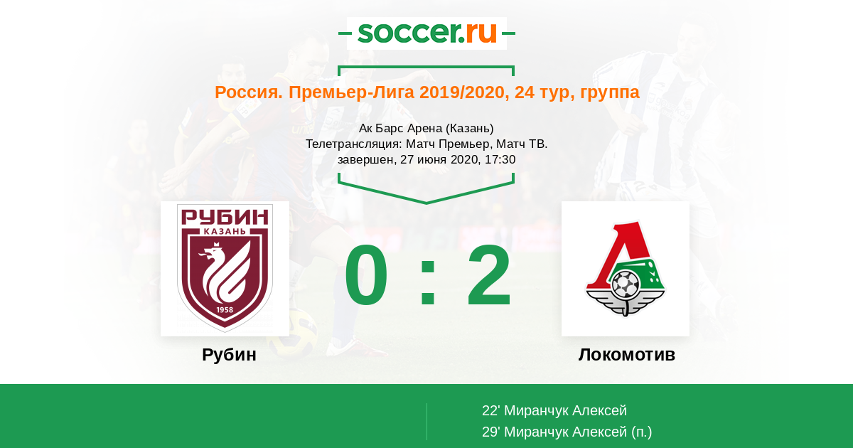 Приветствуем всех болельщиков российского футбола на трансляцию матча между казанским "Рубином" и московским "Локомотивом". Команды решают задачи, находясь в разных частях турнирной таблицы. Они порадовали поклонников в предыдущем туре и постараются закрепить успех. "Локомотив" выиграл последние три матча, но покорится ли четвёртая победа кряду "железнодорожникам" в выездном поединке с "Рубином"? Сайт https://www.soccer.ru проведёт прямую текстовую онлайн трансляцию матча, следить за событиями на поле и комментировать игру для вас будет Старчеус Сергей.