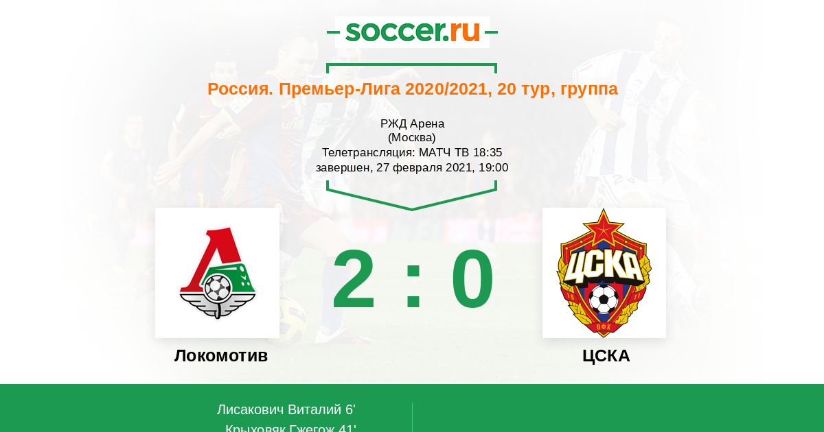 Хороший футбол показали команды, "Локомотив" был лучше готов к этому дерби. Забив быстрый гол, "железнодорожники" не стали закрываться, а увеличили преимущество в счёте. Футболисты ЦСКА оказались не готовы к такому развитию событий и ничего не смогли с этим поделать. Проиграв, ЦСКА всё-же сохранил за собой второе место в турнирной таблице как минимум до завтра, где конкурент в лице "Спартака" проведёт свой матч против казанского "Рубина". Прямую текстовую онлайн трансляцию матча для вас провёл Старчеус Сергей. Любите футбол и следите за новостями на портале https://www.soccer.ru !