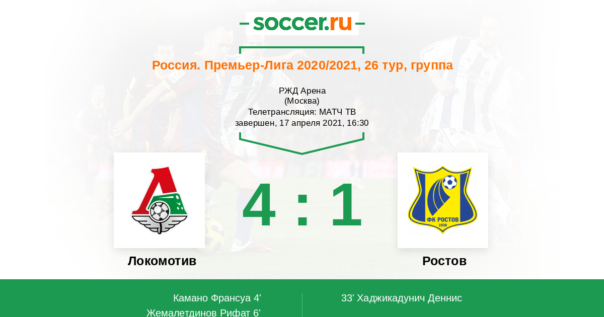 Финальный свисток главного арбитра встречи прозвучал. "Локомотив" добыл разгромную победу над "Ростовом" со счетом 4:1. Спасибо, что следили за развитием событий поединка вместе с "Соккер.ру".