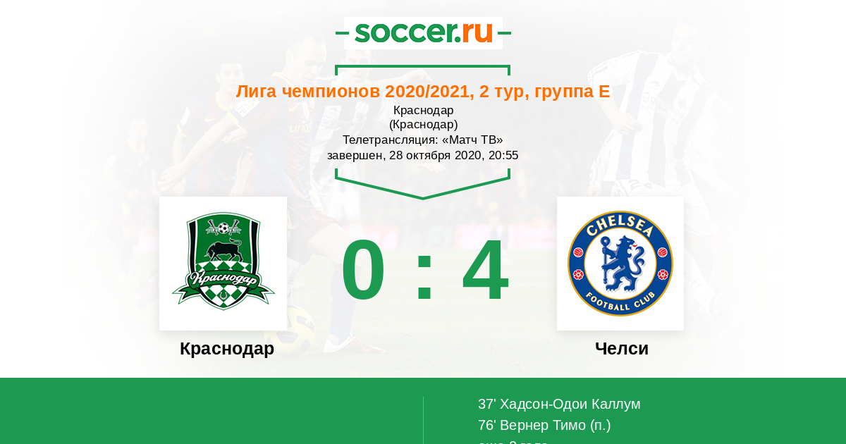 90+5' Все! Матч завершен! "Краснодар" на своем поле с разгромным счетом 0:4 уступил лондонскому "Челси". Создали несколько опасных моментов хозяева, но подвела "Краснодар" реализация. "Аристократы" же своим моменты реализовали. Для Вас прямую онлайн-трансляцию этого поединка провел Андрей Бабенчук. Оставайтесь на https://www.soccer.ru/!