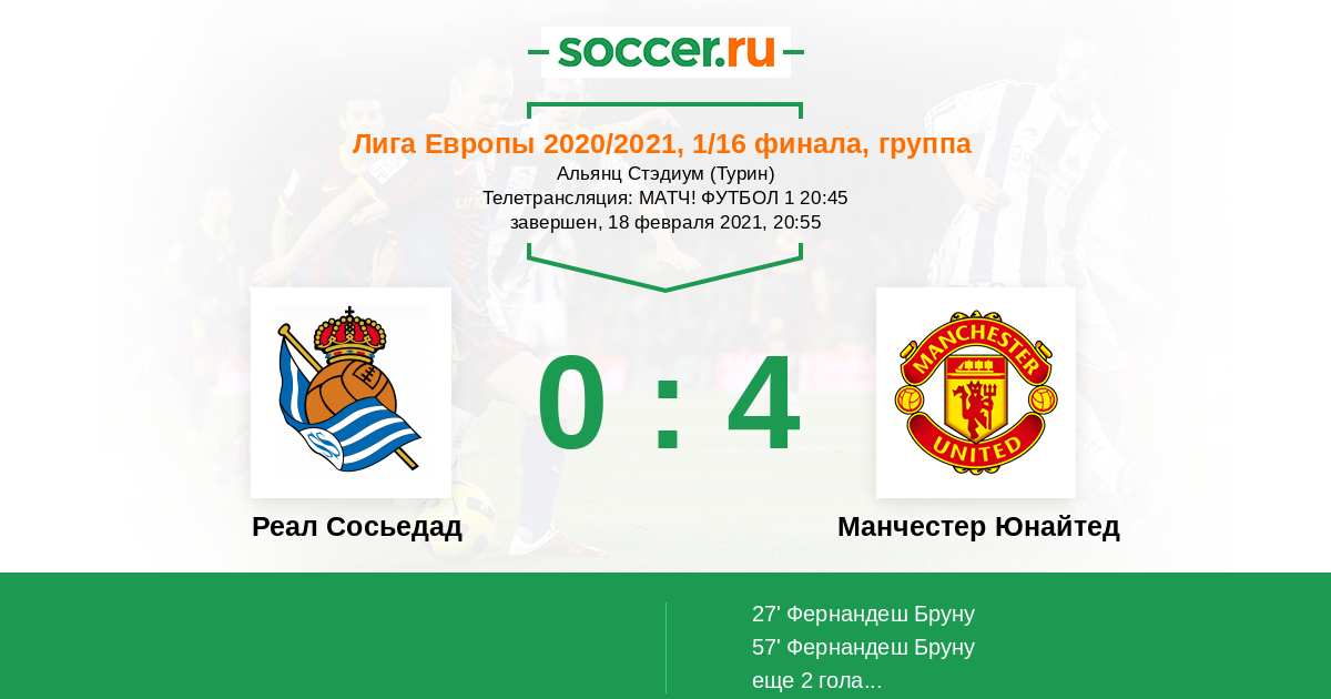 Не ожидал такого счета и с учетом того что против испанцев тяжело играем. Бруно конечно шикарен, а Рэшфорд по классике запорол пару 100% моментов, но и отдал две голевые и сам все-таки забил. Рад что дебютировал Диалло. В ответке жду ротацию. А Сосьедад в обороне был плох за что и наказали, только вратарь у них хорош.