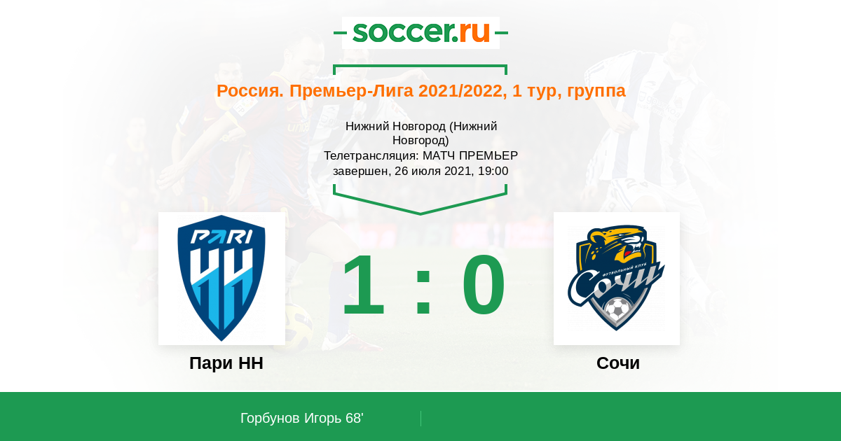 Здравствуйте, уважаемые любители футбола. Приглашаем вас на текстовую онлайн-трансляцию матча первого тура чемпионата России между "Нижним Новгородом" и "Сочи". Обслужит поединок бригада арбитров во главе с Павлом Шадыхановым. Вести текстовую онлайн-трансляцию матча для вас будет Андросян Артем.