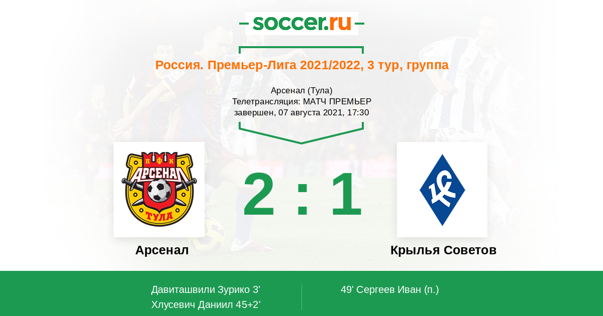 Все! Матч завершен! Тульский "Арсенал" на своем поле обыграл "Крылья Советов" со счетом 2:1 благодаря голам Зурико Давиташвили и Даниила Хлусевича. В составе волжан голом отметился Иван Сергеев. Для Вас прямую онлайн-трансляцию этого поединка провел Андрей Бабенчук. Оставайтесь на "Соккер.Ру"!