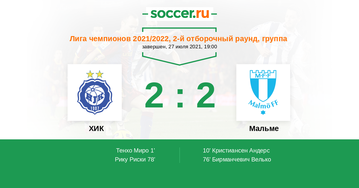 В прошлом раунде квалификации шведы обыграли «Ригу». В первой игре они победили 1:0, а во втором поединке сыграли вничью 1:1. Также помимо победы над ХИКом «небесно-голубые» выиграли в чемпионате Швеции у «Мьельбю» 2:0, «Дегерфорса» 5:0 и «Сириуса» 4:0. «Мальме» — один из самых титулованных клубов Швеции. За последние 5 сезонов гости трижды выигрывали чемпионский титул в чемпионате Швеции.