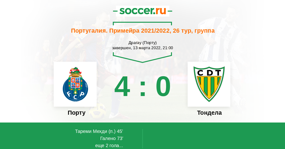 В нынешнем сезоне «Порту» обыгрывает аутсайдеров на «Драгау» крупно и всухую. «Тонделе» не устоять под натиском атак «драконов», инициатива будет полностью на стороне хозяев. «Тондела» сыграет на отбой, но не отобьет три результативные атаки «драконов».