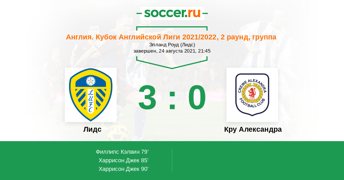 Я думаю в этом противостоянии явным и без заговорчным фаворитом является команда Лидс , команды соперники находятся как говорится в разных весовых категориях. Здесь стоит только одна задача, сколько мячей отправят в ворота Крю Александра. ТБ 2.50 .