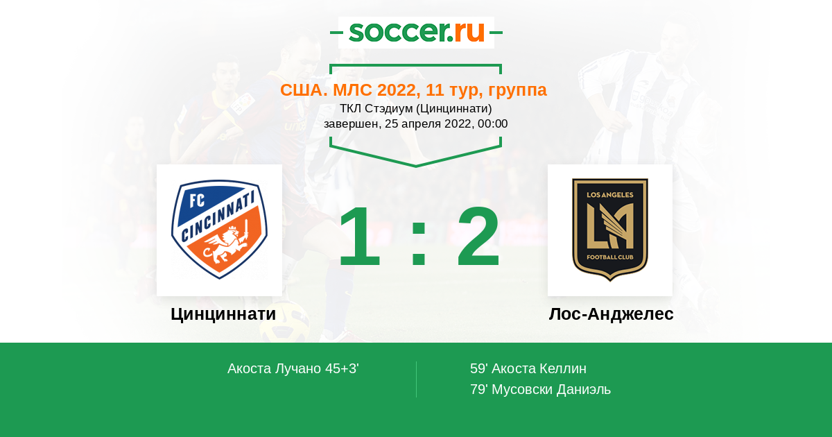 45+3' ГолЛоготип ЦинциннатиАкоста Лучано (10, п) (Логотип ЦинциннатиБреннер (9, н)) - 1:0