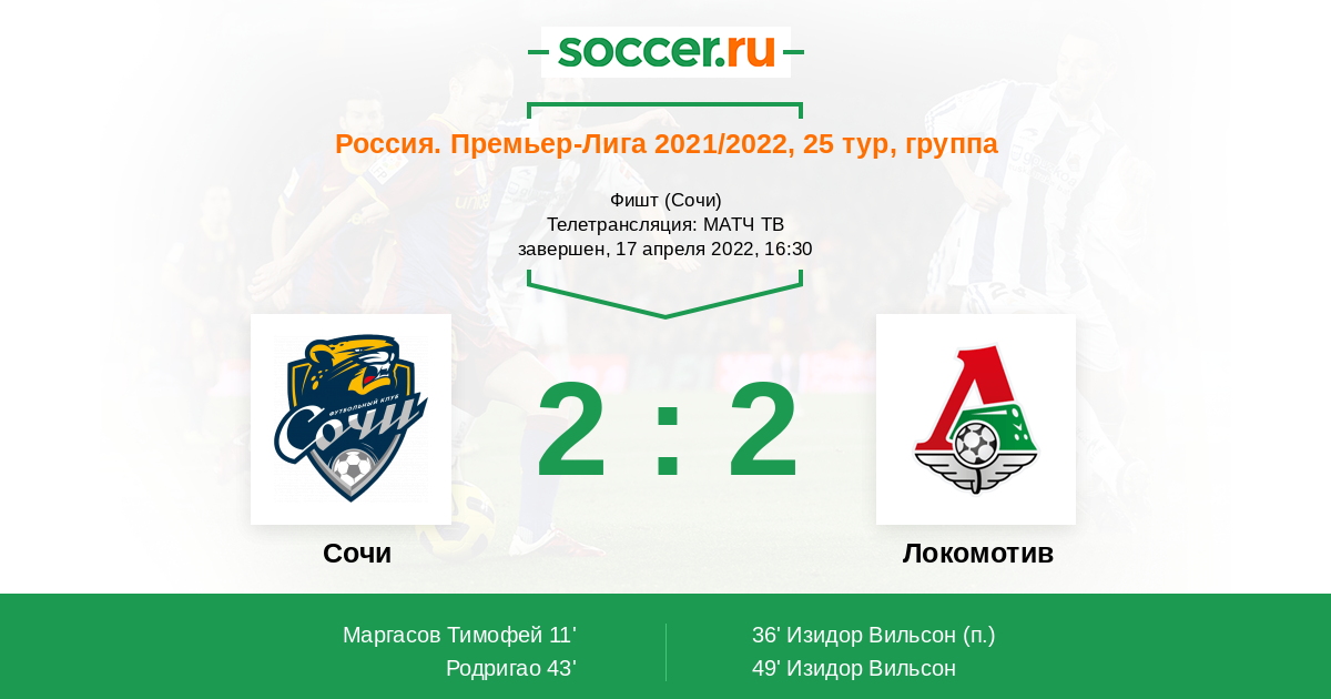 Добрый день всем любителям непредсказуемых футбольных матчей в российской Премьер-лиге! В 25-м туре "Сочи" будет принимать "Локомотив", и в этой игре может произойти всё что угодно. Соперники, претендующие на призовое место, должны продемонстрировать в очном противостоянии высокий уровень футбола. Им важно максимально пополнить баланс на финише чемпионата. "Сочи" проиграл три последних матча "Локомотиву", получится ли у южан прервать эту серию? Сайт https://www.soccer.ru проведёт прямую текстовую онлайн трансляцию матча, следить за событиями на поле и комментировать игру для вас будет Старчеус Сергей.