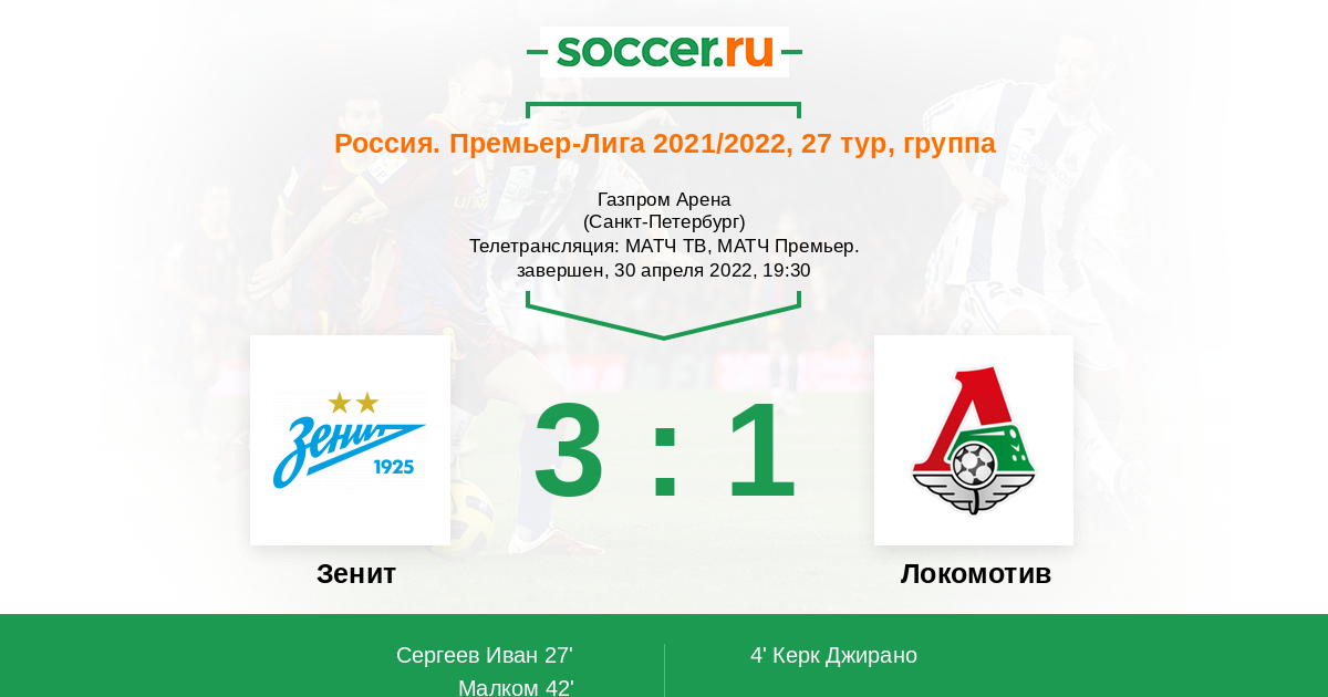 Рады приветствовать всех любителей футбола на матче 27-го тура РПЛ, в котором питерский "Зенит" принимает московский "Локомотив". Команда Семака оформит четвёртое подряд чемпионство, если сегодня победит, так что мотивация у питерцев должна быть запредельная. Хозяева котируются здесь безоговорочными фаворитами. Смогут ли они это подтвердить на деле? Сайт https://www.soccer.ru проведёт прямую текстовую онлайн трансляцию матча, следить за событиями на поле и комментировать игру для вас будет Старчеус Сергей.