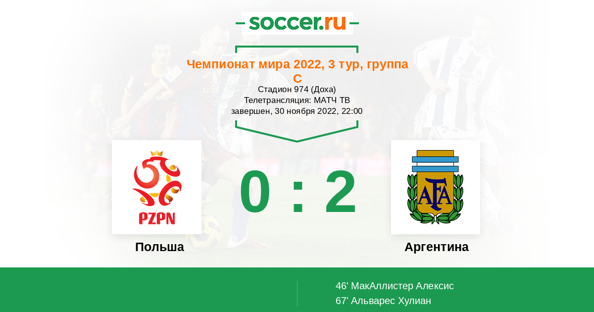 Добрый вечер, уважаемые любители футбола мирового уровня! В группе "С" на ЧМ-2022, который проходит в Катаре сегодня развернётся нешуточная борьба за выход в 1/8 финала. В одном из матчей сборной Польши сыграет против сборной Аргентины. Сможет ли Месси остановить набравшую ход Польшу? Сайт https://www.soccer.ru проведёт прямую текстовую онлайн трансляцию матча, следить за событиями на поле и комментировать игру для вас будет Старчеус Сергей.