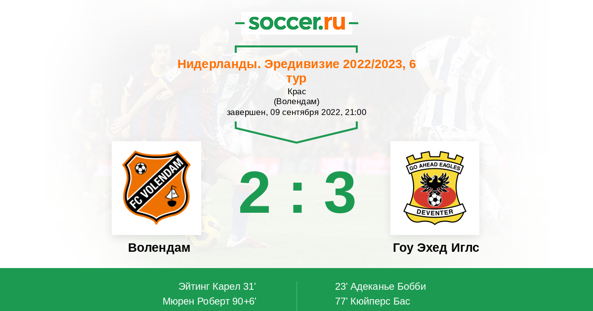 Играют две команды со дна турнирной таблицы. У Волендама дела чуть получше, чем у их соперника Гоу Эхед Иглс, проигравшего все матчи. Фактор своего поля должен сказаться и помочь Волендаму победить.