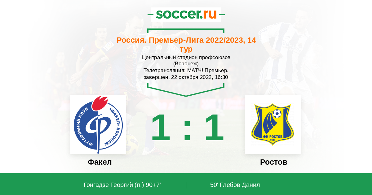 Добрый день, уважаемые любители российского футбола! В 14-м туре РПЛ воронежский "Факел" попробует удивить крепкий "Ростов" Валерия Карпина и в очередной раз отобрать очки у команды из верхней части турнирной таблицы. "Факел" не проигрывает 5 матчей подряд в чемпионате, сумеет ли "Ростов" прервать эту серию? Сайт https://www.soccer.ru проведёт прямую текстовую онлайн трансляцию матча, следить за событиями на поле и комментировать игру для вас будет Старчеус Сергей.