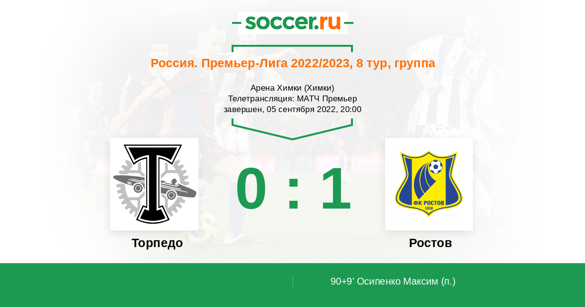Добрый вечер, уважаемые любители российского футбола! Сегодня завершать программу 8-го тура РПЛ будут "Торпедо" и "Ростов". Чёрно-белые осели на дне турнирной таблицы, не помогла и отставка главного тренера. "Ростов" едет в подмосковные Химки в статусе фаворита матча, но всё ли так просто будет на поле? Ведь хозяевам отступать уже некуда. Сайт https://www.soccer.ru проведёт прямую текстовую онлайн трансляцию матча, следить за событиями на поле и комментировать игру для вас будет Старчеус Сергей.