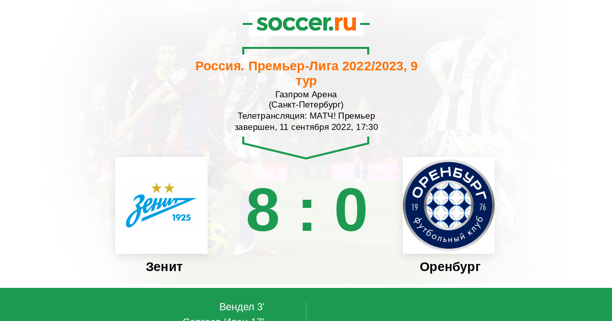 Рады приветствовать всех поклонников на матче 9-го тура РПЛ, в котором действующий чемпион "Зенит" будет принимать "Оренбург". Питерцы тут однозначно фавориты, они набрали хороший ход и перестали терять очки, как это было вначале чемпионата. Сумеет ли "Оренбург" создать трудности команде Семака? Сайт https://www.soccer.ru проведёт прямую текстовую онлайн трансляцию матча, следить за событиями на поле и комментировать игру для вас будет Старчеус Сергей.
