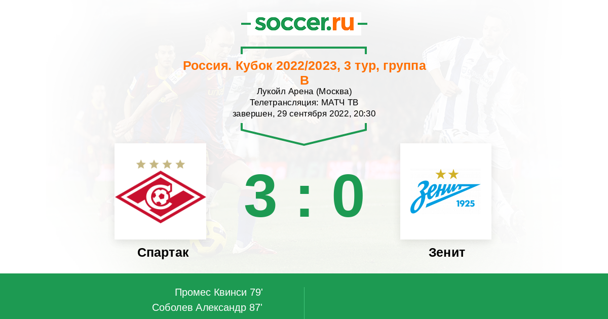 В группе "В" Кубка России "Спартак" становится единоличным лидером с 9-ю очками в активе, а вот "Зениту", на удивление многих, предстоит борьба за выход из группы, кто бы мог подумать. "Зенит" ничем не смог удивить красно-белых, всё читалось и перехватывалось. Но и удача сегодня была на стороне "Спартака", в первом тайме Кузяев попал в штангу, а во втором Малком. Спасибо командам за накал страстей и игру, ожидаем не менее интересного матча в Санкт-Петербурге. Прямую текстовую онлайн трансляцию матча для вас провёл Старчеус Сергей, до новых встреч на https://www.soccer.ru !