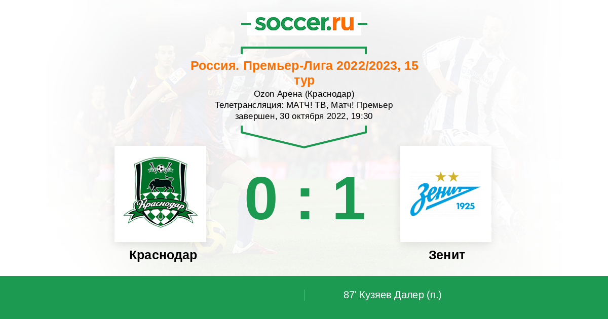 Добрый вечер, уважаемые любители российского футбола! Завершать программу 15-го тура РПЛ будут "Краснодар" и "Зенит". Этот матч закроет первую половину чемпионата и по праву считается центральной игрой тура. Матчи между "Краснодаром" и "Зенитом" всегда получаются интересными, а главное результативными. Сайт https://www.soccer.ru проведёт прямую текстовую онлайн трансляцию матча, следить за событиями на поле и комментировать игру для вас будет Старчеус Сергей.