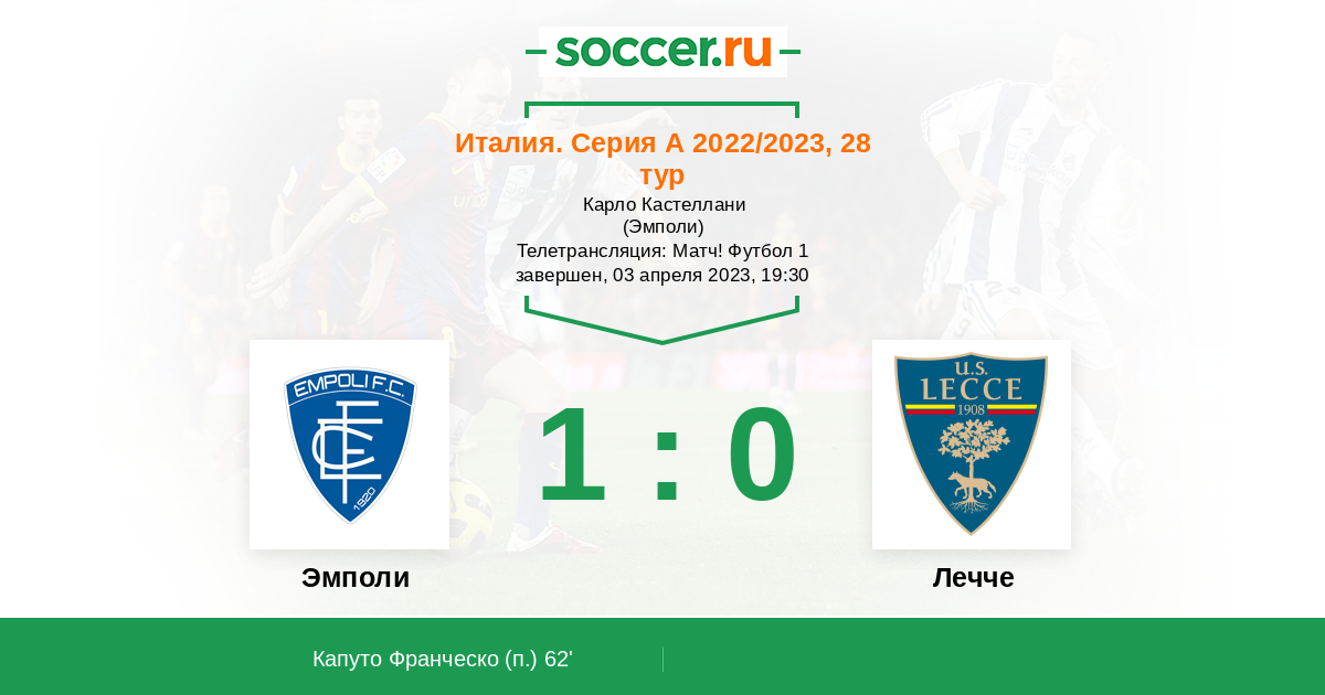 Эмполи, Карло Кастеллани, зрителей: 8844 Телетрансляция: Матч! Футбол 1
