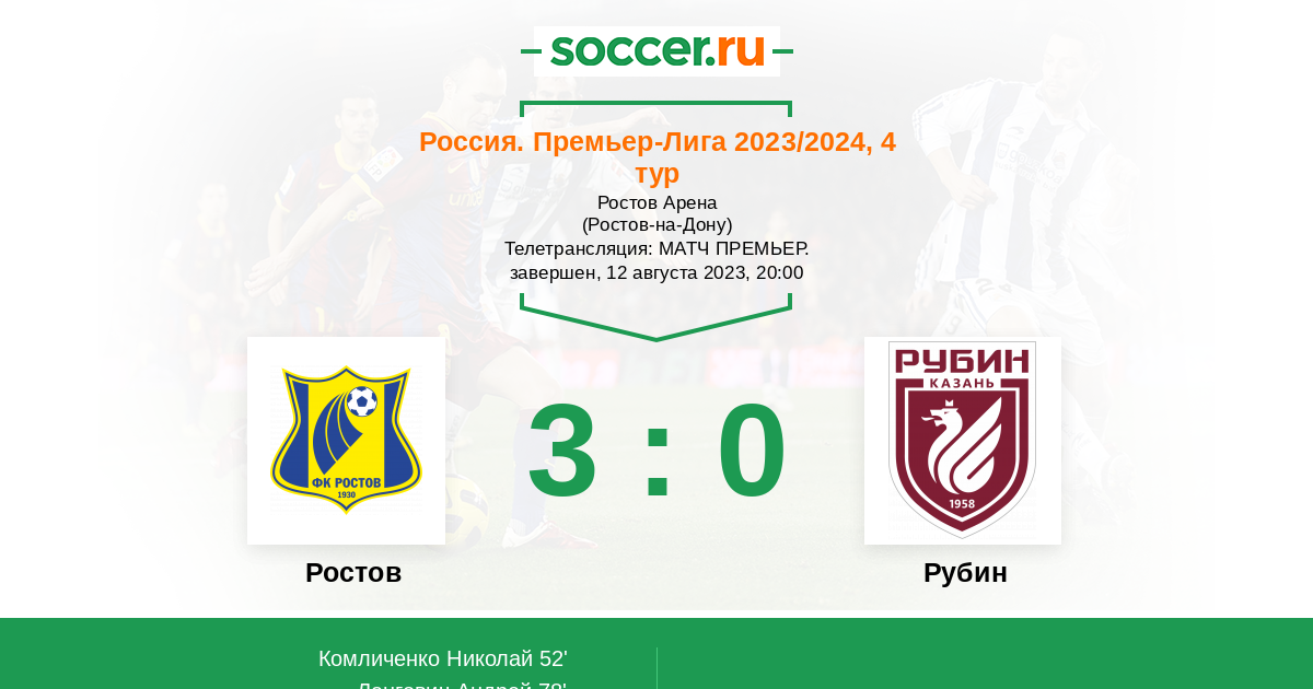Завершать субботнюю программу 4-го тура РПЛ будут "Ростов" и "Рубин". В прошлом сезоне "Ростов" до самого последнего тура претендовал на попадание в медали, в этом сезоне повторить успех будет крайне сложно. Два последних матча жёлто-синие проиграли, сумеют ли они сегодня прервать эту негативную для себя серию? Сайт https://www.soccer.ru проведёт прямую текстовую онлайн трансляцию матча, следить за событиями на поле и комментировать игру для вас будет Старчеус Сергей.
