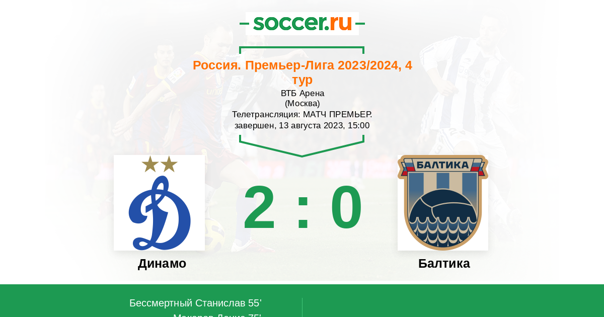 Продолжаются матчи 4-го тура РПЛ, воскресную программу будут открывать "Динамо" и "Балтика". Команды одержали победы в прошлом туре и постараются развить свой успех. Положение "Динамо" в таблице чуть лучше, но на старте сезона любое поражение может откинуть команду в самый низ. Сможет ли "Балтика" сотворить сенсацию и разжиться очками на "ВТБ Арене"? Сайт https://www.soccer.ru проведёт прямую текстовую онлайн трансляцию матча, следить за событиями на поле и комментировать игру для вас будет Старчеус Сергей.