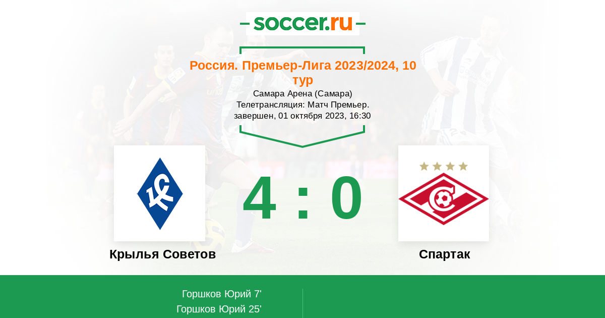 Добрый день уважаемые поклонники российского футбола! 10-й тур РПЛ подарит нам матч, в котором самарские "Крылья Советов" сыграют против "Спартака". Эта игра одна из самых интересных в туре. В текущем сезоне РПЛ "Крылья" дома ещё не проигрывали, сумею ли красно-белые прервать эту серию? Сайт https://www.soccer.ru проведёт прямую текстовую онлайн трансляцию матча, следить за событиями на поле и комментировать игру для вас будет Старчеус Сергей.