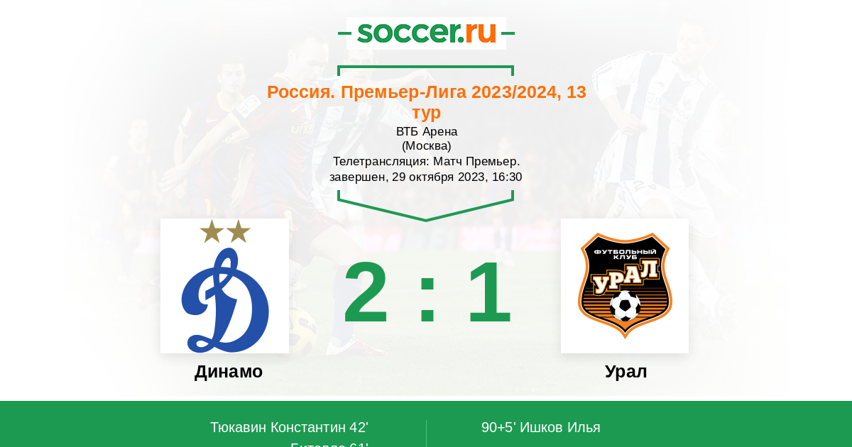 Прервалась безвыигрышная серия "Динамо", пусть и не в самом ярком матче по качеству. "Урал" сегодня наиграл больше чем на один гол, но где-то подвела реализация, а где-то "Динамо" выручил Игорь Лещук. "Урал" продолжает скатываться в кризис, тренерскому штабу предстоит искать пути по стабилизации ситуации. Прямую текстовую онлайн трансляцию матча для вас провёл Старчеус Сергей. Далее перемещаемся на центральный матч тура, ЦСКА сыграет против лидера чемпионата "Краснодара", смотрите текстовую онлайн трансляцию тут: https://www.soccer.ru/matches/1334437