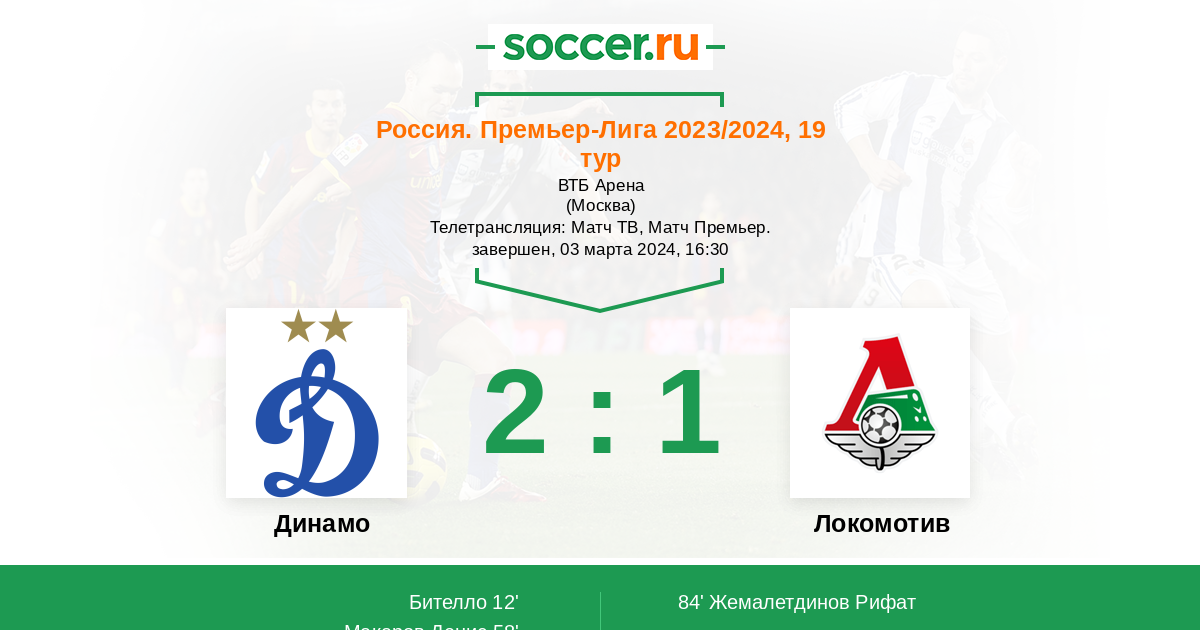 Рады приветствовать всех любителей российского футбола на матче 19-го тура РПЛ, в котором "Динамо" сыграет против "Локомотива". Эта игра является одной из самых интересных в туре, так как команды находятся рядом в турнирной таблице и претендуют на попадание в медали по окончании сезона. В двух последних очных матчах бело-голубые не обыгрывали "Локомотив", получится ли победить сегодня? Сайт https://www.soccer.ru проведёт прямую текстовую онлайн трансляцию матча, следить за событиями на поле и комментировать игру для вас будет Старчеус Сергей.