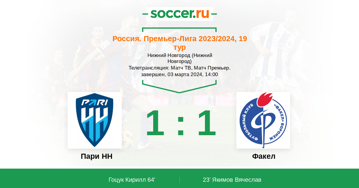 Воскресная программа 19-го тура РПЛ откроется в Нижнем Новгороде, где местный "Пари НН" сыграет против "Факела" из Воронежа. В первом круге сильнее оказались футболисты "Факела", так что у "Пари НН" сегодня есть все шансы взять реванш, вот толко пока непонятно в каком физическом состоянии команды подошли к возобновлению чемпионата. Сайт https://www.soccer.ru проведёт прямую текстовую онлайн трансляцию матча, следить за событиями на поле и комментировать игру для вас будет Старчеус Сергей.