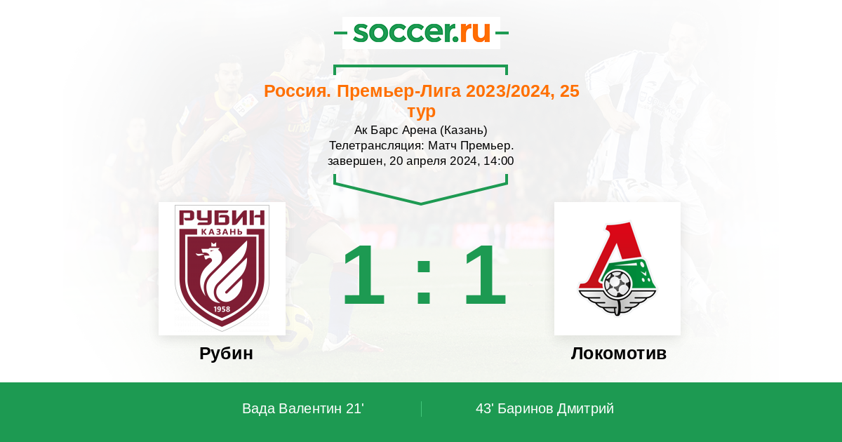 Рады приветствовать всех любителей российского футбола! Субботняя программа 25-го тура РПЛ начнётся матчем в Казани, где "Рубин" сыграет с "Локомотивом". В последних матчах дела у "Рубина" складывались не лучшим образом, команда выиграла лишь одну игру из пяти. Получится ли у казанцев порадовать своих болельщиков сегодня? Сайт https://www.soccer.ru проведёт прямую текстовую онлайн трансляцию матча, следить за событиями на поле и комментировать игру для вас будет Старчеус Сергей.