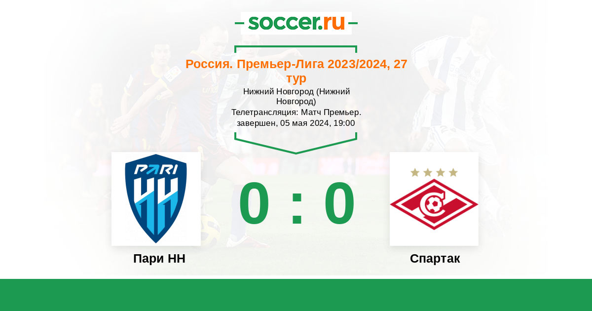 Игра получилась тяжёлой и для одних и для других. "Пари НН" смогли выстоять и прервали свою серию из шести матчей из поражений. "Спартак" очень много владел мячом, но забить так и не получилось, да и моментов особо у гостей не было. "Пари НН" набирает 29 баллов и теперь всего на 2 балла отрывается от зоны переходных матчей, так что вся борьба ещё впереди. Прямую текстовую онлайн трансляцию матча для вас провёл Старчеус Сергей. Любите футбол, болейте за красивую игру и до новых встреч на https://www.soccer.ru !