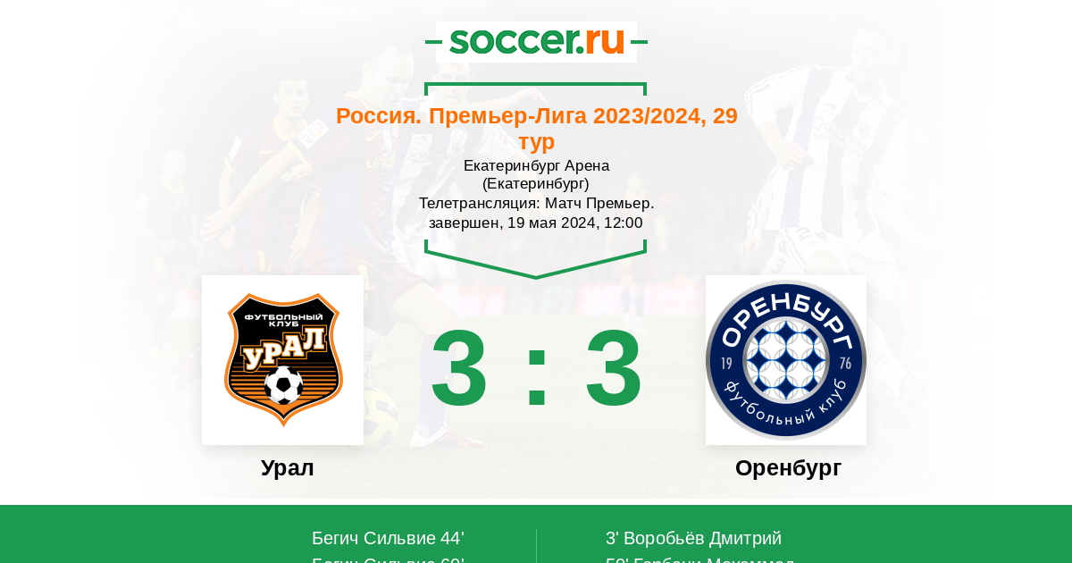Классный матч получился в Екатеринбурге, соперники сегодня были достойны друг друга. Голы забивались на заглядение, хочется чтобы таких матчей было побольше в РПЛ. Интрига всё ещё жива, неудачники будут определяться в последнем туре, но и "Урал" и "Оренбург" чуть-чуть улучшили свои позиции в турнирной таблице. Текстовую онлайн трансляцию матча для вас провёл Старчеус Сергей. Впереди сегодня ещё не менее интересные игры, оставайтесь с https://www.soccer.ru !