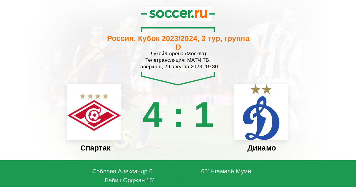 "Спартак" побеждает в третьем матче Кубка России и единолично возглавляет свой квартет. "Динамо" тяжело входило в эту игру, результат был сделан как раз в первые 20-ть минут матча. После перерыва "Динамо" вышли на поле с другим настроением и смогли навязать свою игру сопернику, правда их хватило всего на один гол. Спасибо командам за этот яркий матч, именно за голы мы и любим этот вид спорта. Прямую текстовую онлайн трансляцию матча для вас провёл Старчеус Сергей. Всё самое интересное ещё впереди, оставайтесь с https://www.soccer.ru !