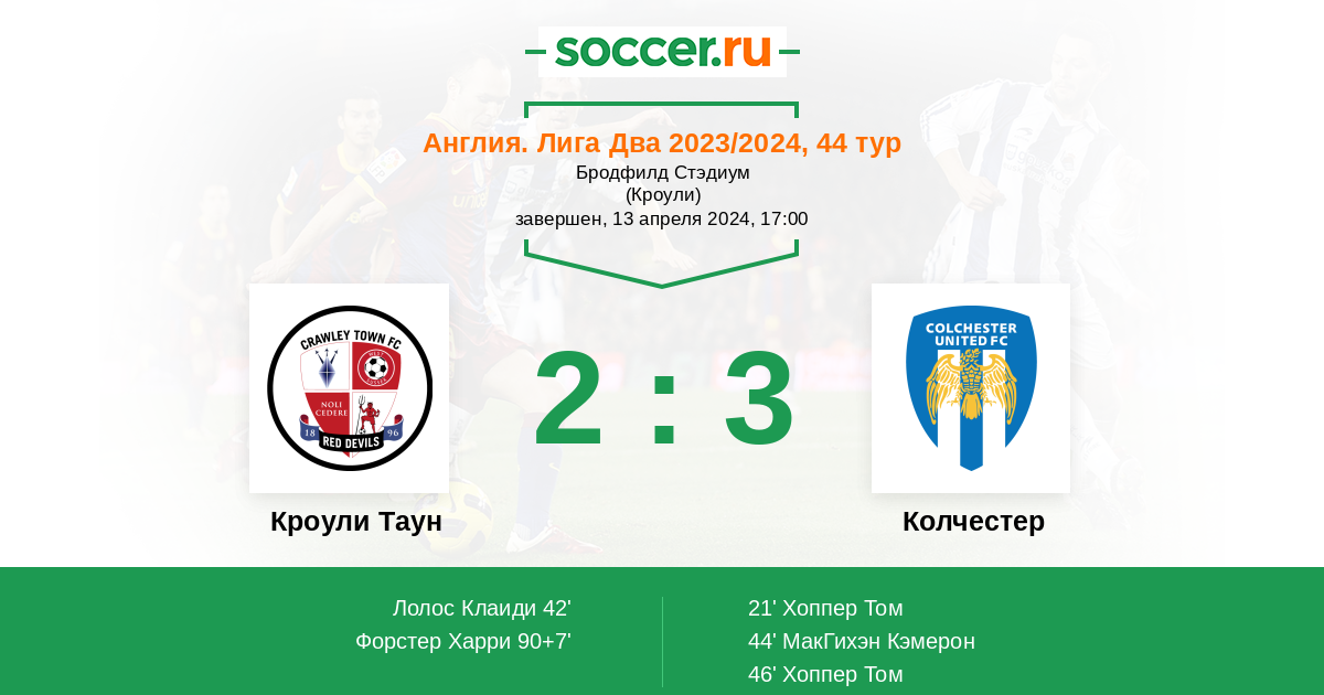 Кроули Таун - Колчестер: обзор матча 13 апреля 2024