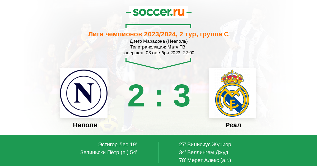 Очень качественный матч в исполнении двух команд, по итогам которого "Реал" забил на один гол больше и выиграл. Нельзя сказать, что "Наполи" сыграли плохо, по моментам они как минимум наиграли на ничью. Отличный матч провёл Хвича Кварацхелия, но по-настоящему включился в игру только во втором тайме. После двух сыгранных туров "Реал" на первом месте в группе, а "Наполи" вторые, но вся борьба ещё впереди. Прямую текстовую онлайн трансляцию матча для вас провёл Старчеус Сергей. Впереди много ярких матчей, оставайтесь с https://www.soccer.ru !