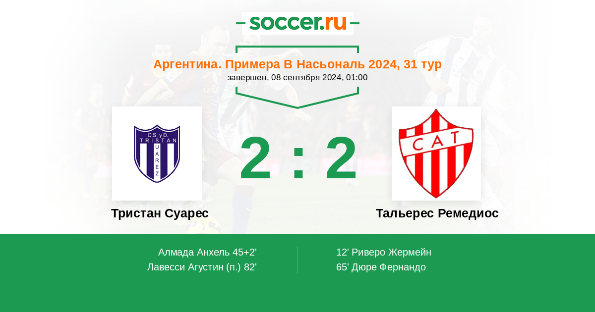 Тристан Суарес - Тальерес Ремедиос: обзор матча 8 сентября 2024
