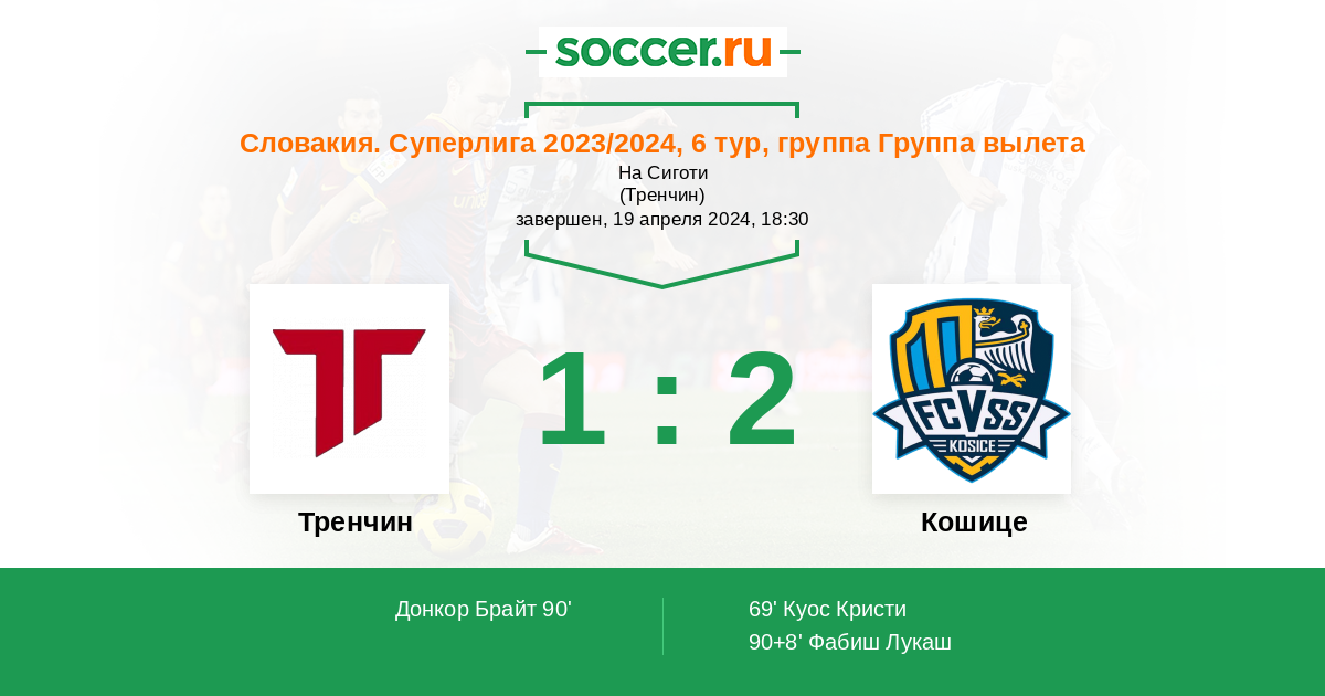 90+8' ГолЛоготип КошицеФабиш Лукаш (19, з) (Логотип КошицеДжонс Зиен (10, н)) - 1:2