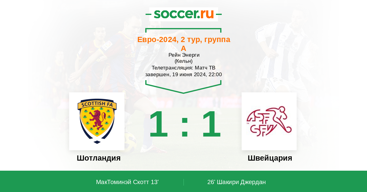Закрывать сегодняшний игровой день на Евро-2024 выпало сборным Шотландии и Швейцарии. Для Шотландии сегодня может стать вопрос о дальнейшем участии на турнире. После разгромного поражения от Германии шотландцам необходимо реабилитироваться, но сил может не хватить. Зацепится ли Шотландия сегодня за очки? Сайт https://www.soccer.ru проведёт прямую текстовую онлайн трансляцию матча, следить за событиями на поле и комментировать игру для вас будет Старчеус Сергей.