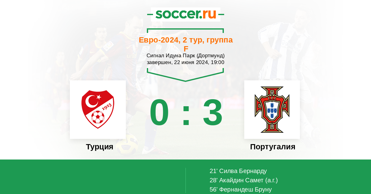 Если у португальцев игра пойдёт с самого начала по их сценарию, то счёт матча, вероятнее всего, может завершиться со счётом 0:2. Но на этом турнире нет слабых команд. Молодым, голодным до побед футболистам Турции захочется больше насолить более именитым оппонентам. Поэтому возможен и счёт 1:2, но я склоняюсь больше к первому варианту.