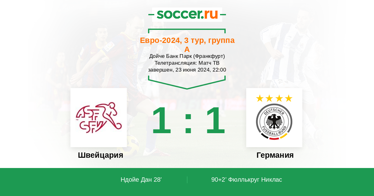 Рады приветствовать всех поклонников футбола! Завершился 2-й тур группового этапа на Евро-2024, сегодня стартует 3-й тур, матчи в котором будут играться синхронно в рамках одной группы и одного игрового дня. В группе A сыграют Швейцария с Германией за которыми мы и будем пристально следить, а также в параллельном матче будут играть Шотландия с Венгрией. Сайт https://www.soccer.ru проведёт прямую текстовую онлайн трансляцию матча, следить за событиями на поле и комментировать игру для вас будет Старчеус Сергей.
