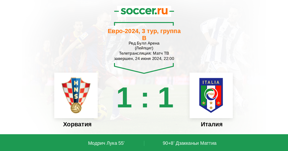 Фантастическая развязка случилась на последних секундах компенсированного времени, по итогам этого матча Италия заняла второе место в группе и получила свою путёвку в плей-офф. А вот Хорватия опустилась на третье место, но среди тех команд, которые в других группах заняли третье место Хорватия имеет худший показатель, а это значит, что "шашечные" прощаются с Евро-2024! Прямую текстовую онлайн трансляцию матча для вас провёл Старчеус Сергей. Любите футбол за его эмоции и непредсказуемость, до новых встреч на https://www.soccer.ru !