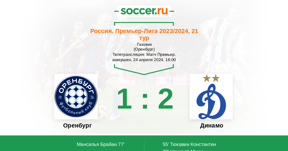 Добрый день, уважаемые любители российского футбола! Сегодня проходят матчи перенесённого 21-го тура РПЛ, в одном из них "Оренбург" сыграет с "Динамо". Эти команды совсем недавно уже встречались в рамках Кубка России Пути регионов и тогда сильнее оказалось "Динамо" (2:4). Сегодня ситуация совсем другая, "Оренбург" делает ставку именно на РПЛ, чтобы не вылететь по окончании сезона. Сайт https://www.soccer.ru проведёт прямую текстовую онлайн трансляцию матча, следить за событиями на поле и комментировать игру для вас будет Старчеус Сергей.