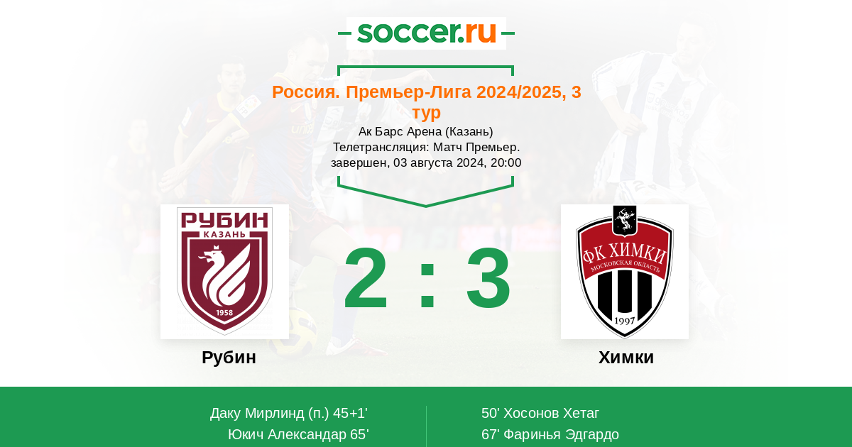 Отличная игра получилась на "Ак Барс Арене", в которой было забито пять голов. "Рубин" дважды по ходу матча выходил вперёд, но "Химки" дважды быстро отыгрывались, а под конец матча забили победный гол с пенальти и в итоге набрали три балла. Франк Артига проделал хорошую работу, раз заставил свою команду преобразиться во втором тайме. Прямую текстовую онлайн трансляцию матча для вас провёл Старчеус Сергей. Любите футбол за его непредсказуемость и эмоции, до новых встреч на https://www.soccer.ru !