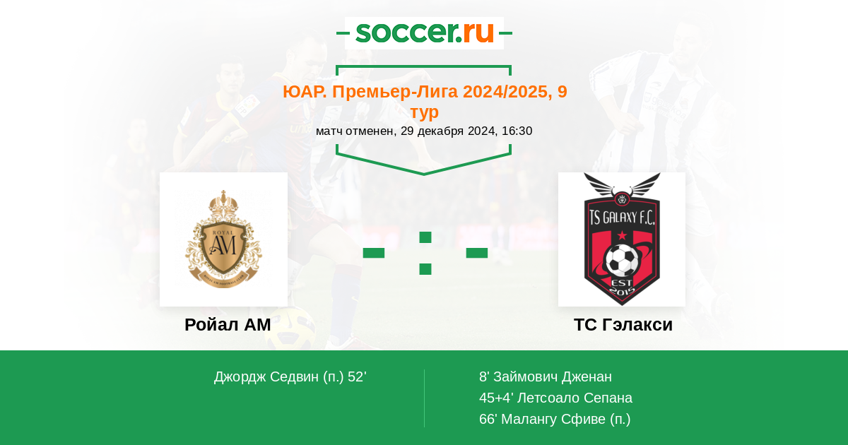 90+3' Желтая карточкаЛоготип Ройал АММагака Сибусисо (26, п) получил ж.к.