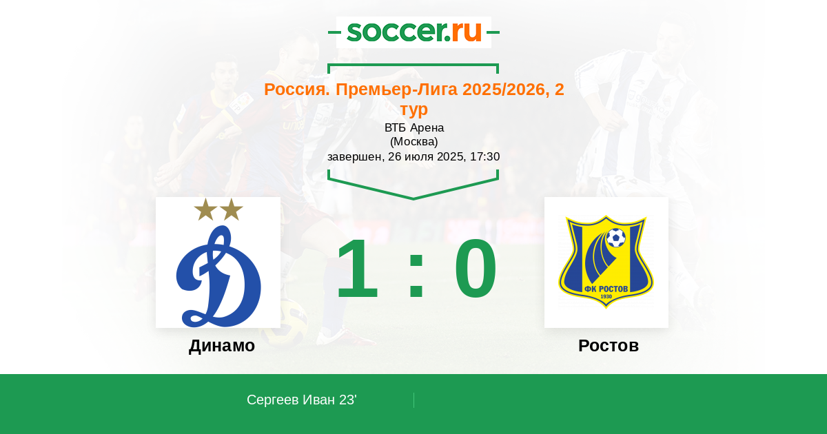 23' ГолЛоготип ДинамоСергеев Иван (33, н) (Логотип ДинамоКасерес Хуан (4, з)) - 1:0